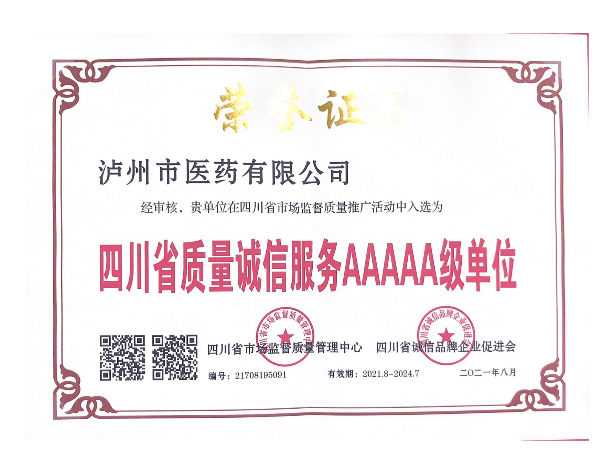 近日,瀘州市醫(yī)藥有限公司在四川省市場監(jiān)督質(zhì)量推廣活動中被四川省市場監(jiān)督質(zhì)量管理中心、四川省誠信品牌企業(yè)促進會評選為:“四川省質(zhì)量誠信服務(wù)AAAAA級單位”和“四川省AAAAA級標(biāo)桿優(yōu)秀企業(yè)”。這是繼“四川省質(zhì)量信譽服務(wù)AAA單位”、“四川省質(zhì)量信譽雙優(yōu)單位”、“3.15誠信經(jīng)營優(yōu)秀企業(yè)”、“3.15質(zhì)量合格無投訴單位”后新的質(zhì)量榮譽稱號。